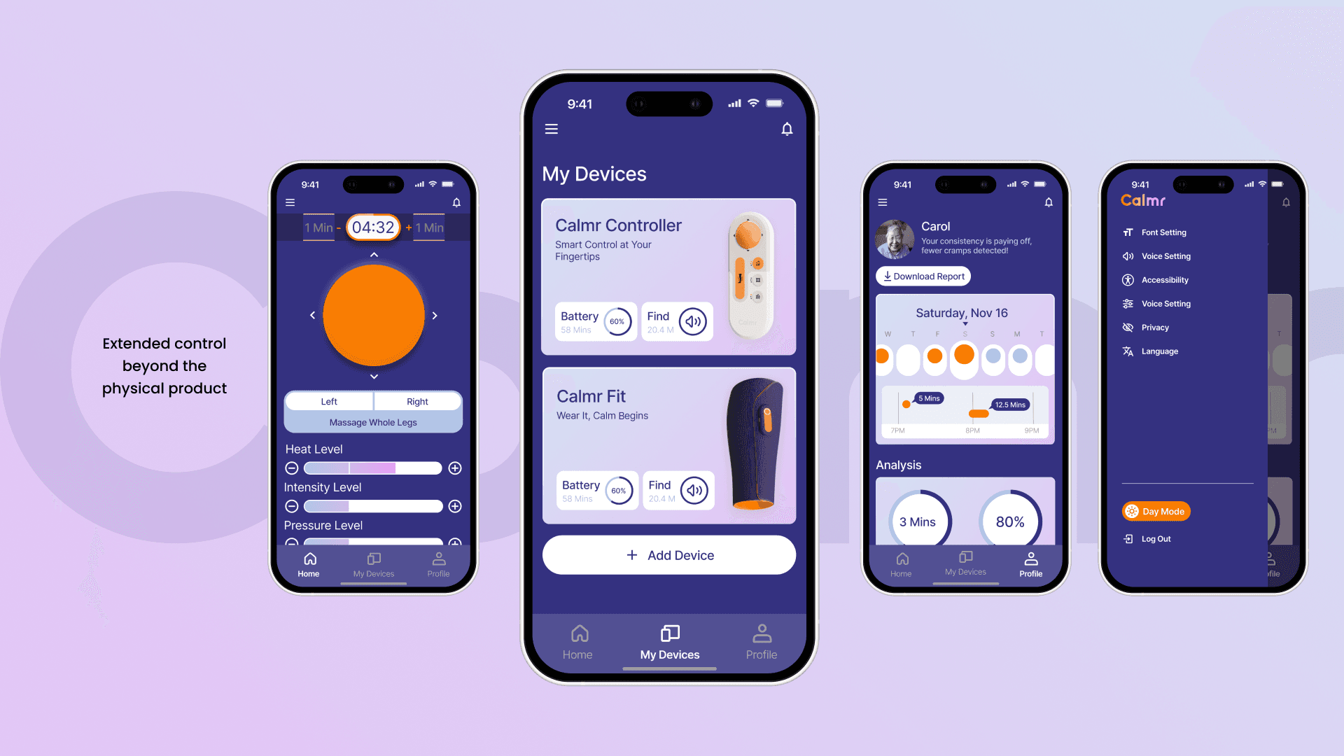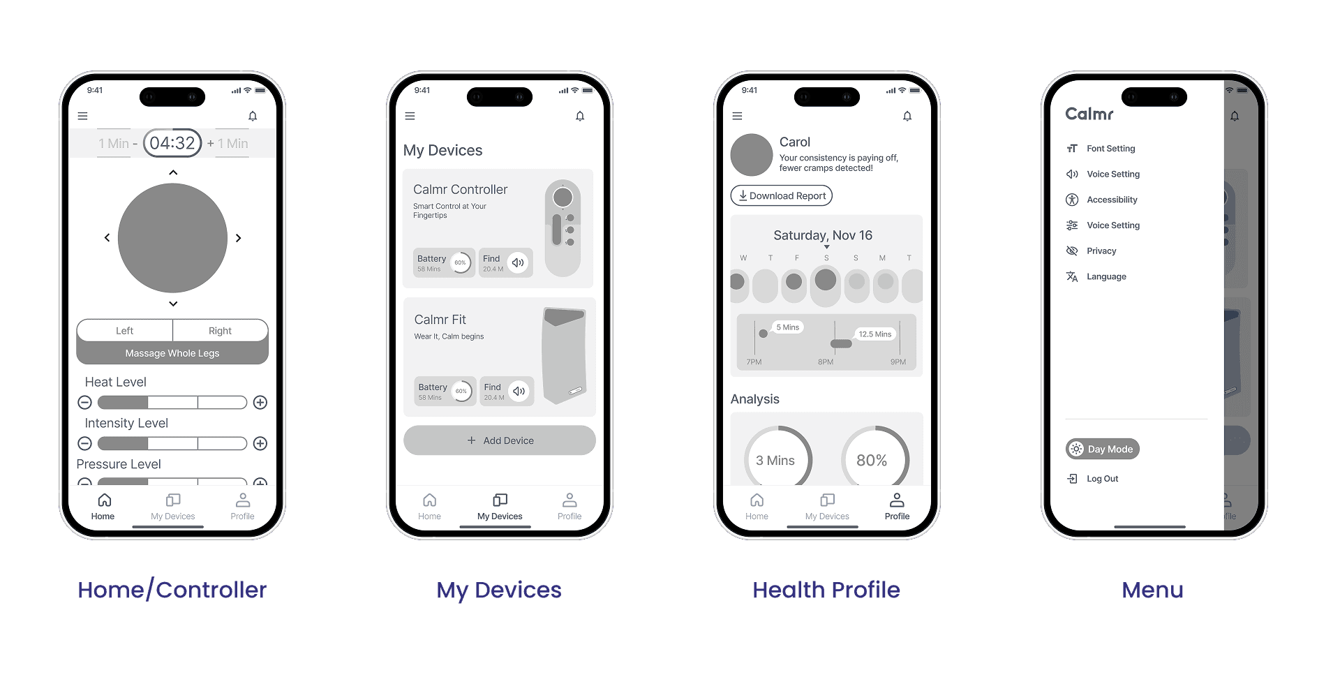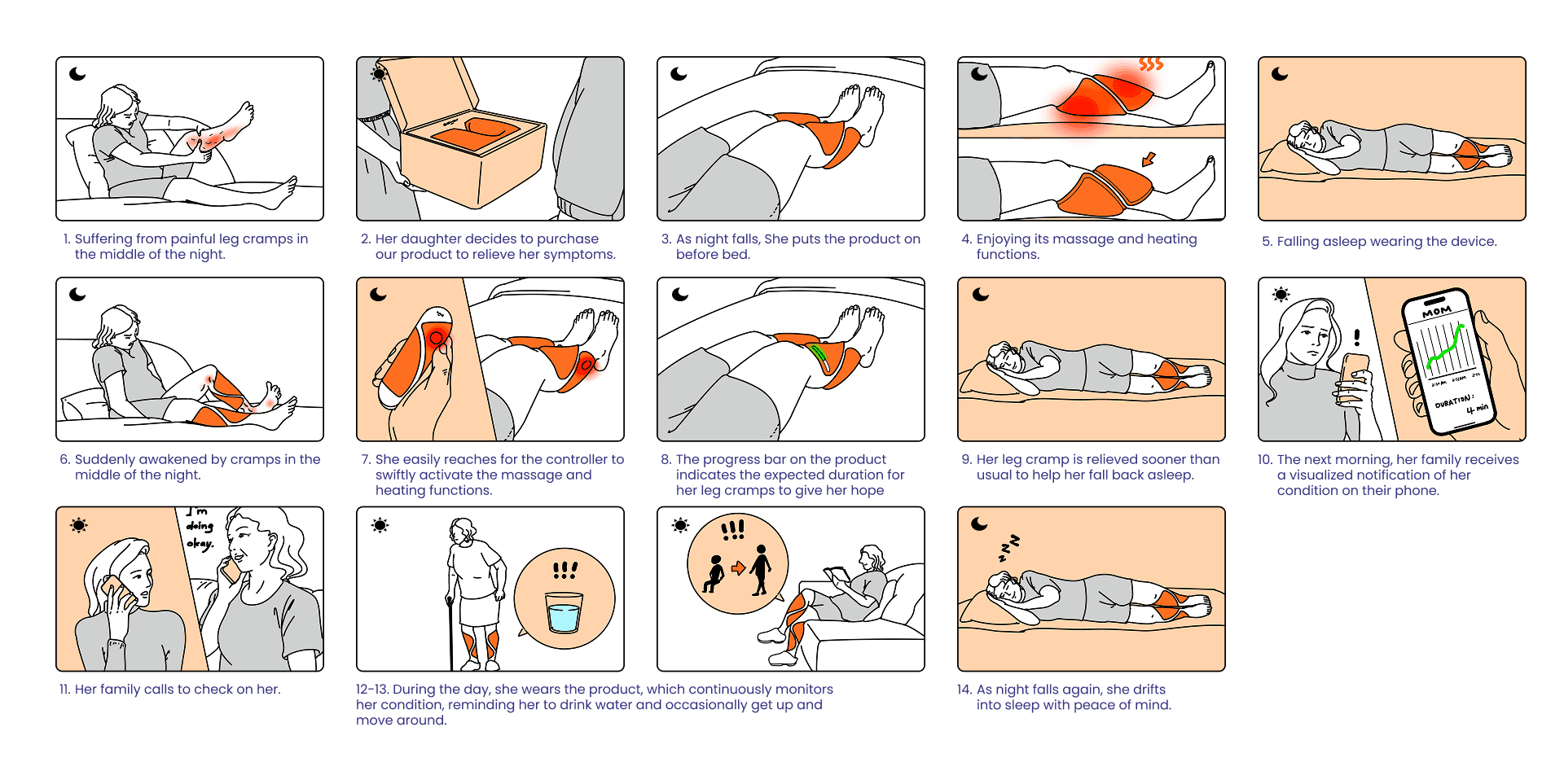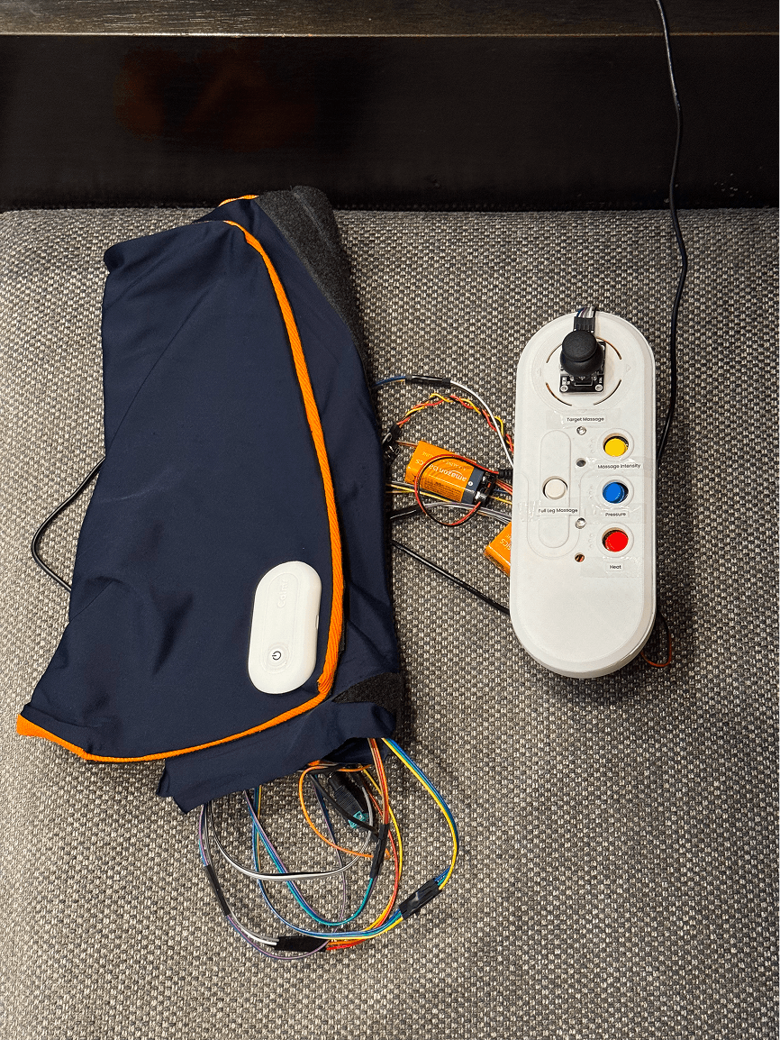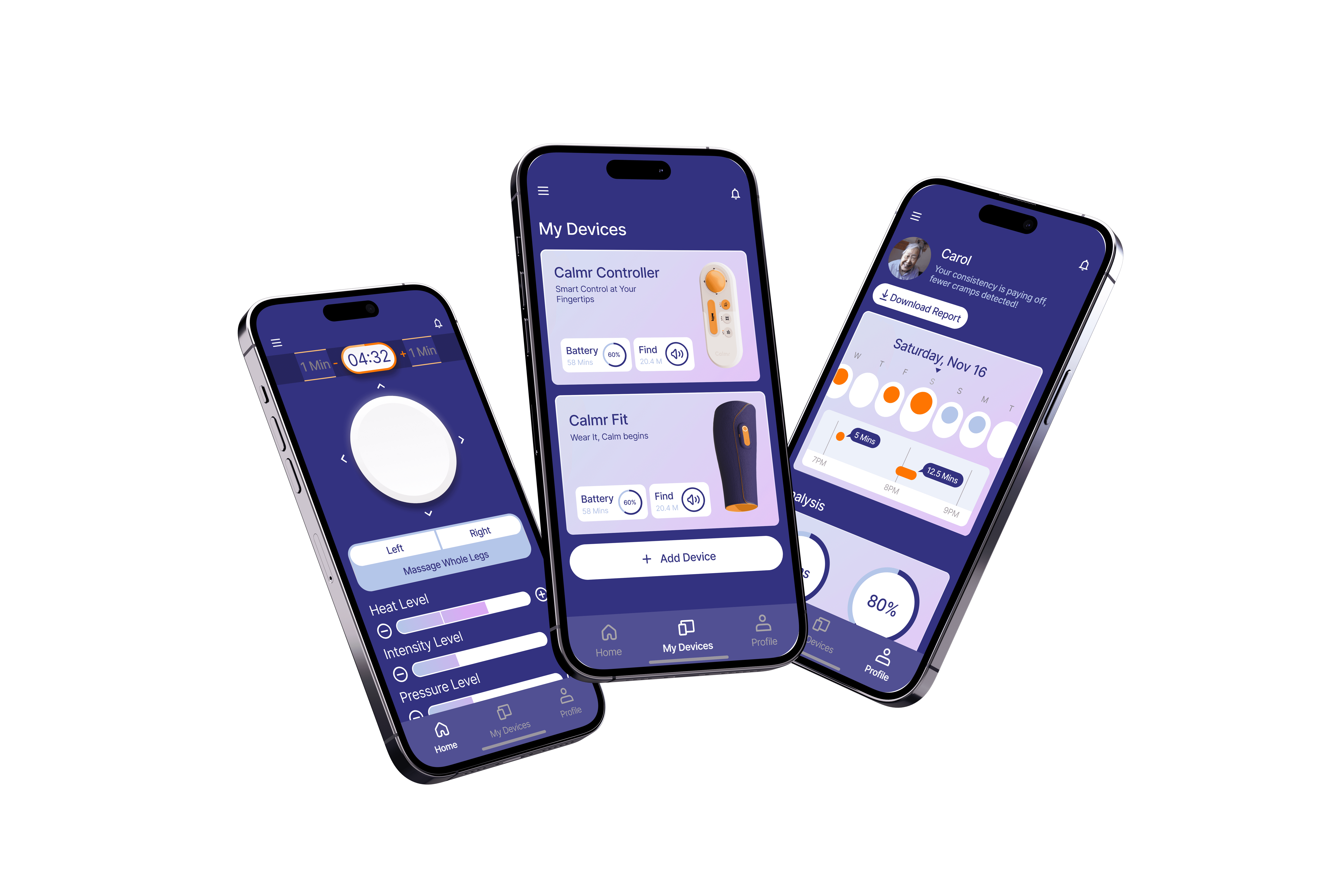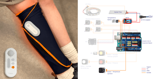 Calmr provides an integrated wearable and digital experience that helps elderly users prevent and relieve nocturnal leg cramps through intuitive interactions. The wearable features modular components that deliver heat therapy, massage, and pressure therapy, tailored to individual needs.
