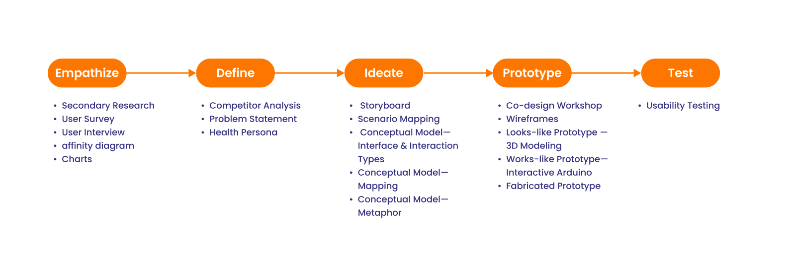 Research: Secondary Research (Literature Review) · Quantitative Research (Survey Design) · Qualitative Research (User Interview) · Affinity Diagram · Competitor Analysis · Health Persona · Storyboard · Conceptual Model · Scenario Mapping · Usability Testing