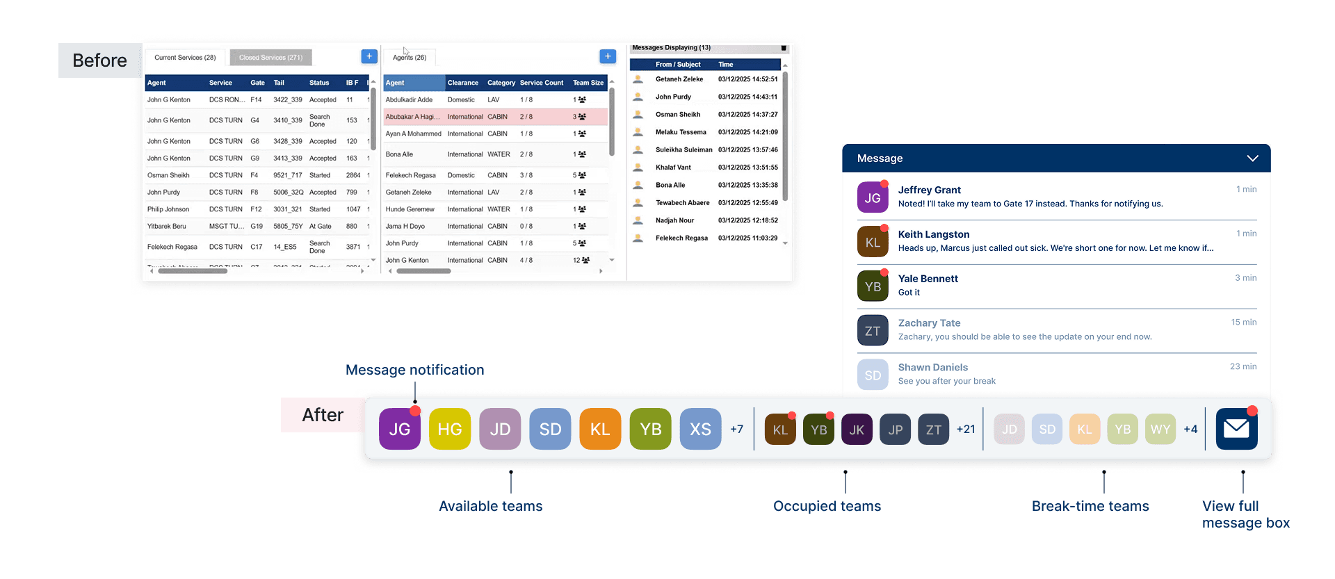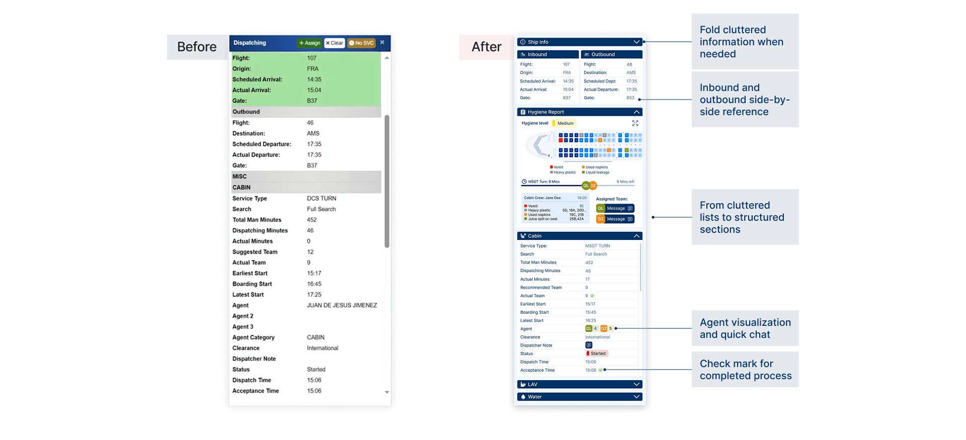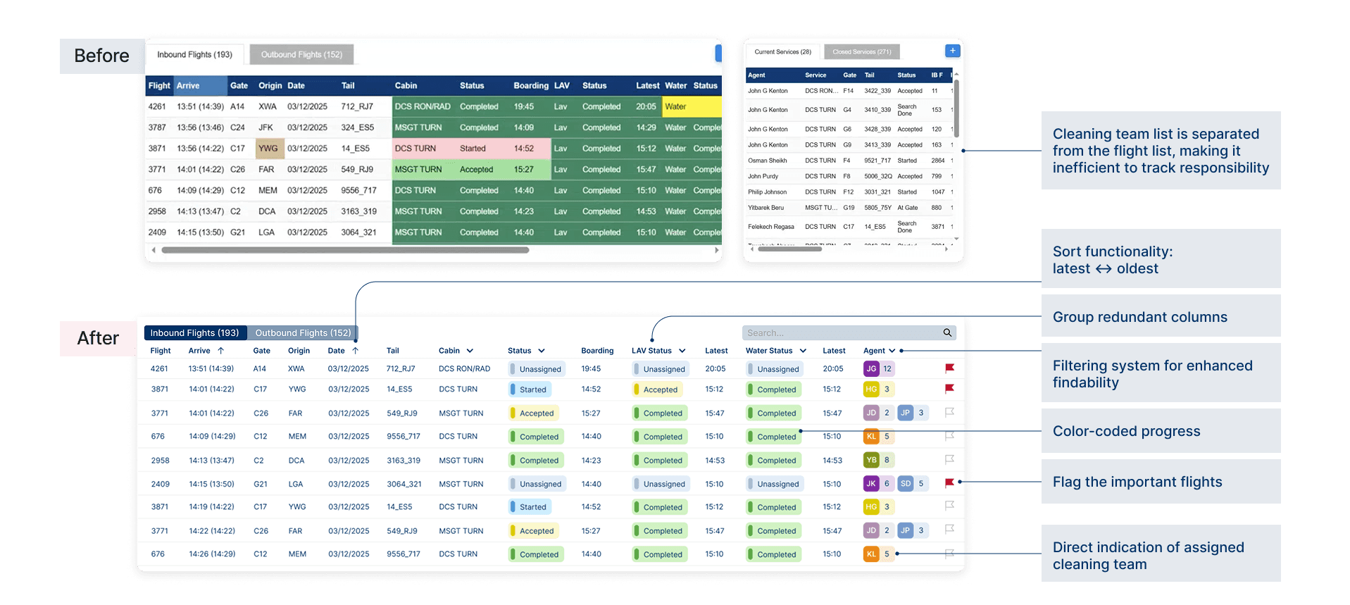 The previous, fixed-width layout forced horizontal scrolling to reach key information, causing users to miss critical content. The redesign consolidates repetitive elements to reduce space, adds richer sorting to offer flexible views, , and introduces agent initials with semantic color coding to improve recognition.